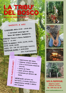 Immersi nel ricco ambiente boschivo di Bedigliora, La Tribù del Bosco propone un doposcuola in natura per bambine e bambini dai 6 – 11 anni, il mercoledì pomeriggio. Tramite attività di gioco e di esplorazione, i bambini imparano a costruire un riparo, un’altalena di corda, a riconoscere piante ed animali, a preparare la merenda sul fuoco, ad utilizzare in sicurezza attrezzi come coltelli, trapani e seghetti, e tant’altro ancora!